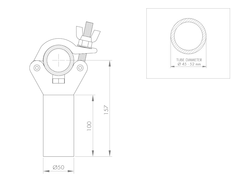 Clamp coupler with a Ø 50 mm insertion spigot adaptor to attach a single tube to a lifting tower. The 10 cm solid aluminium insertion spigot guarantees maximum resistance and durability.The coupler used for this adaptor is designed to be used on tubes / trusses with an external diameter of from 45 to 52 mm (Coupler ref. ABZ-24).