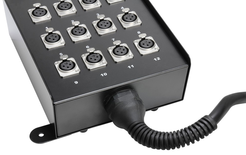 Twelve-channel subcore with permanently attached ten-metre cable terminating in twelve Adam Hall XLR plugs. The all-metal stage box has a solid strain relief in the transitional area between box and cable and an additional mounting lug for permanent installation. The additionally reinforced transition to the terminations prevents fatigue and cable breakage.