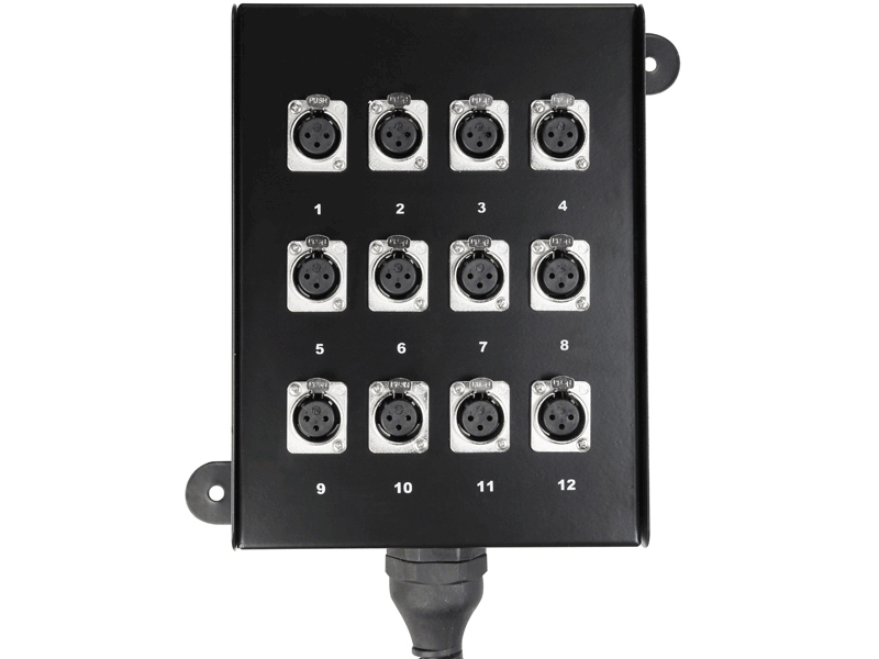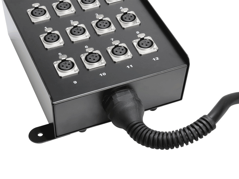 The all-metal stage box has a solid strain relief in the transitional area between box and cable and an additional mounting lug for permanent installation. The additionally reinforced transition to the terminations prevents fatigue and cable breakage.