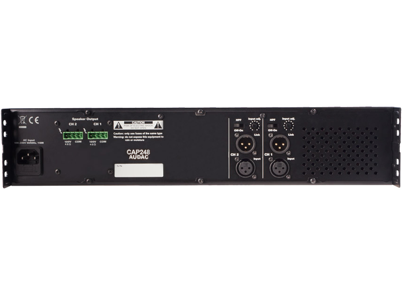 The CAP Series are professional 100V Multi-Channel Power Amplifiers. The CAP248 offers the two channels and has an output power of 480 Watt. This way, a flexible solution is created for Multi-Zone audio distribution systems with two independent zones. They are designed as no-nonsense amplifiers with only the necessary controls and connections, which creates great simplicity in use and installation. A high efficiency and reliability of the devices is achieved by using switching power supplies in combination with Class-D Amplifier technology. A temperature controlled fan constantly keeps all parts within the right operation range, while avoiding excessive buzz. A built-in multipurpose protection circuit protects against DC malfunction, Short circuit, overheating, overload and limits the signal when necessary.