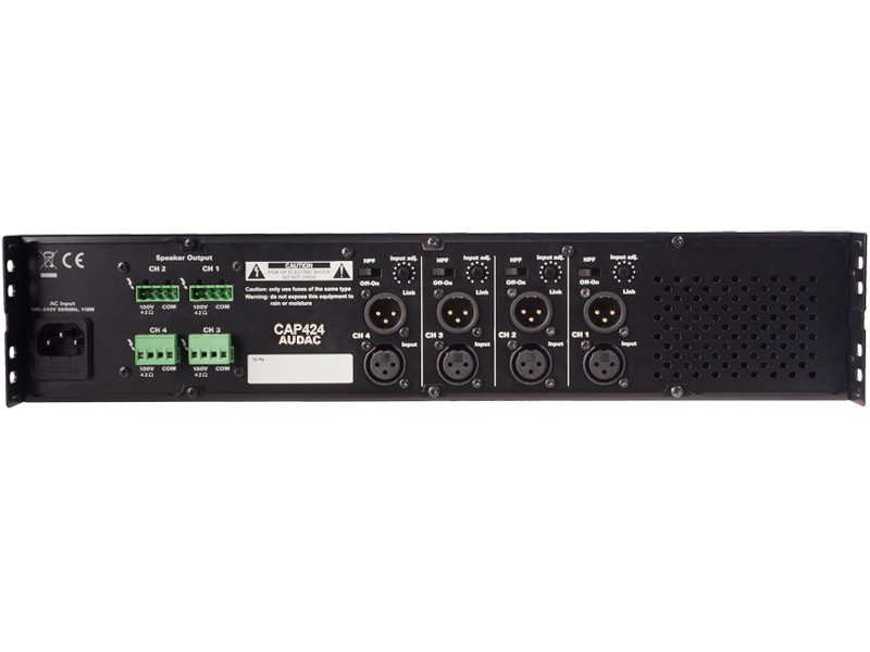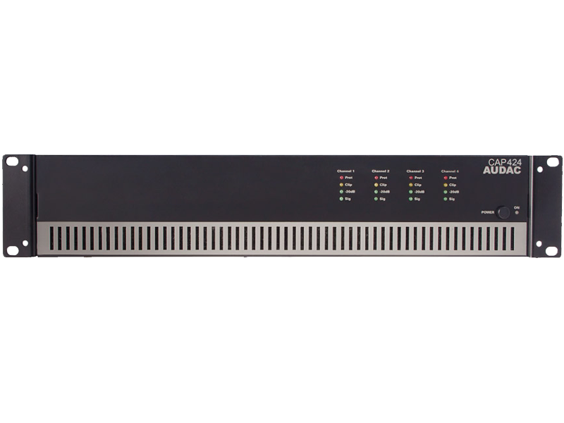 The CAP Series are professional 100V Multi-Channel Power Amplifiers, containing various models with different channels and different output power configuration. CAP424 is a four channel version with an output power 240 Watt. This way, a flexible solution is created for Multi-Zone audio distribution systems with four zones. They are designed as no-nonsense amplifiers with only the necessary controls and connections, which creates great simplicity in use and installation. A high efficiency and reliability of the devices is achieved by using switching power supplies in combination with Class-D Amplifier technology. A temperature controlled FAN constantly keeps all parts within the right operation range, while avoiding excessive buzz. A built-in multipurpose protection circuit protects against DC malfunction, Short circuit, overheating, overload and limits the signal when necessary.
