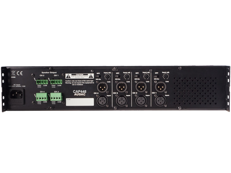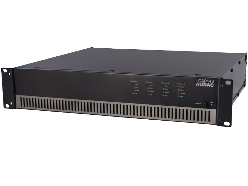 The CAP Series are professional 100V Multi-Channel Power Amplifiers, containing various models with different channels and different output power configuration. CAP448 is a four channel version with an output power 480 Watt. This way, a flexible solution is created for Multi-Zone audio distribution systems with four zones.