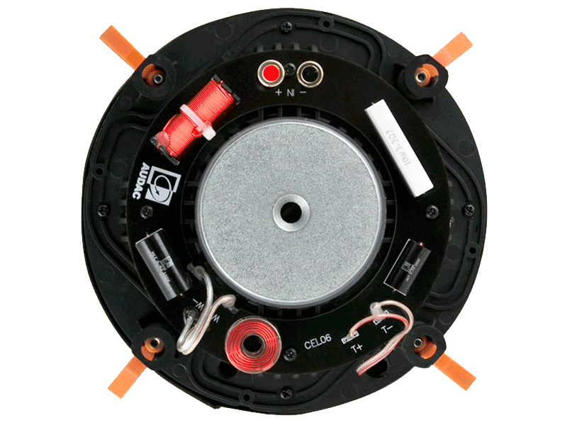 To guarantee a lifetime stability, secure mounting and easy installation, the loudspeaker connection is made using Gold plated spring clamp connectors. The mounting of the loudspeaker into the ceiling should be done by a quick-fixing mechanism which can be tightened by four screws and the front grill is held into place by neodymium magnets.