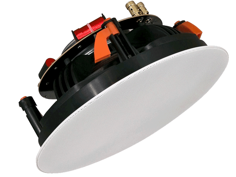 Due to its slim grill design with very thin border of only 1 mm and a limited grill depth which extrudes from the ceiling surface by only 3.2 mm, these speakers will become nearly invisible when mounted. To make them blend in even more, they can be painted in the same colour as the surrounding surface. This elegant and unobtrusive grill is held in place by means of powerful neodymium magnets, making assembly and disassembly very simple, but still reliable enough for keeping the grill in place during the complete lifetime of the loudspeaker.