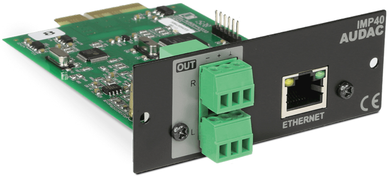 IMP40 is a professional internet radio player featuring SourceCon™ modular technology. This unique technology guarantees true plug & play implementation to any compatible device. When inserted to a supporting slot, the module is instantly installed, discovered and ready for operation without requiring any additional internal wiring or complex configuration. The IMP40 features the unique Linum™ technology which eliminates any unwanted behaviour such as sudden channel hopping or music stops. When the connection is interrupted, automatic switching to inserted media carriers (USB drives)avoids unpleasant silences in background music applications. The audio stream will be automatically and seamlessly restored afterwards. It synchronizes with the vTuner database which contains over 30.000 channels, allowing selection on different criteria such as genre, location, language, … while custom streams can also be added to a preference list up to 100 entries. The input connection is implemented by an RJ45 type connector with indicator LED’s on its panel, allowing connection to any ethernet network. The balanced stereo line output is connected through two 3-pin terminal block connections