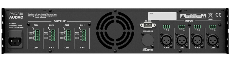 THD + N: Mic < 0.05 dB, Line < 0.01 dB Crosstalk: -85 dB Control possibilities: Front panel, RS232 / TCP/IP, Wall panel (RS485), iPhone / iPad / Integrated website Power supply: 100 ~ 240 V AC / 50 ~ 60 Hz, 24 V DC (emergency power) Power consumption: 9 W PRODUCT FEATURES: Dimensions (Width x Height x Depth): 482 x 88 x 335 mm Weight net: 4.8 kg Unit height: 2 HU PMQ240: SPECIFICATIONS: RMS Power: 4 x 240 W Signal / Noise: > 95 dB