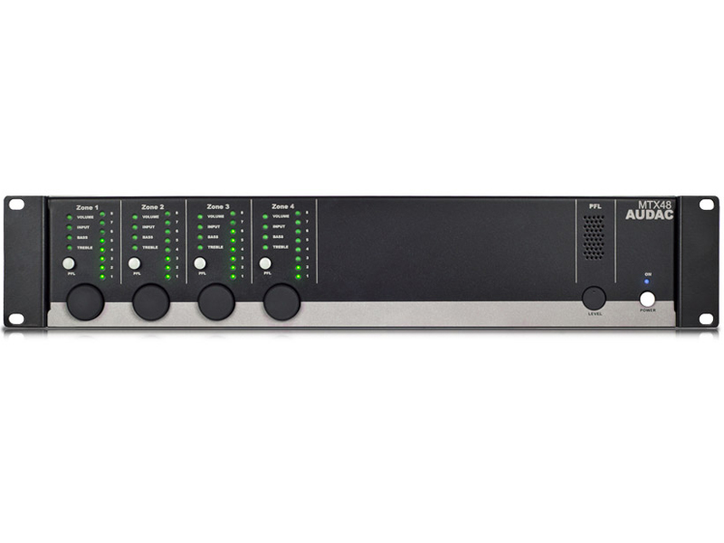 AUDAC MTX48 + PMQ240 + 40 x WX302 MTX48 – 4-zonski višezonski audio matricni sustav. 4 x 8 audio matricni sustav. 2 mikrofonska ulaza s fantomskim i prioritetnim pojačalom. 4 stereo linijska ulaza. 4 stereo balansirana zonska izlaza. PMQ240 je četverokanalno pojačalo snage klase D 100 V s izlaznom snagom od 240 W za svaki kanal. WX302 – 2-smjerni 3″ zidni zvučnik – 8 Ohma / 100 V – 30 W RMS / 20 W transformator.