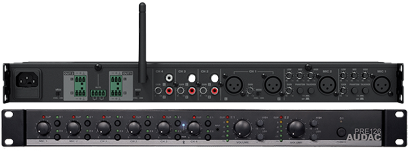 PRE126 is two-zone 6 channel stereo preamplifier containing a variety of input possibilities for microphone and line level audio signals, offering a possibility for a wide range of small to medium sized audio installations in various kinds of applications with a two-zone audio distribution system. It features two balanced mono inputs with phantom power and three band tone control allowing connection of microphones or line level signal sources. The switchable talkover function suppresses background music if a priority signal is present, making it suitable for paging or voice file announcements. The four stereo line level inputs are implemented as a balanced one fitted with XLR connectors and three unbalanced ones fitted with RCA connectors. An integrated Bluetooth receiver (mixed with Ch 3) and 3.5 mm jack connection on its front panel (mixed with Ch 4) are offering convenient wired or wireless connection possibilties for portable and handheld devices including laptops, smartphones and tablets