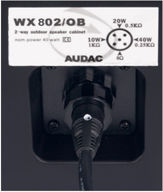 The connections and power settings can be made with the rotatable waterproof connector on the rear side of the loudspeaker. The power can be set in three adjustable steps for 100V and one step for 16 Ohm standard low impedance applications.
