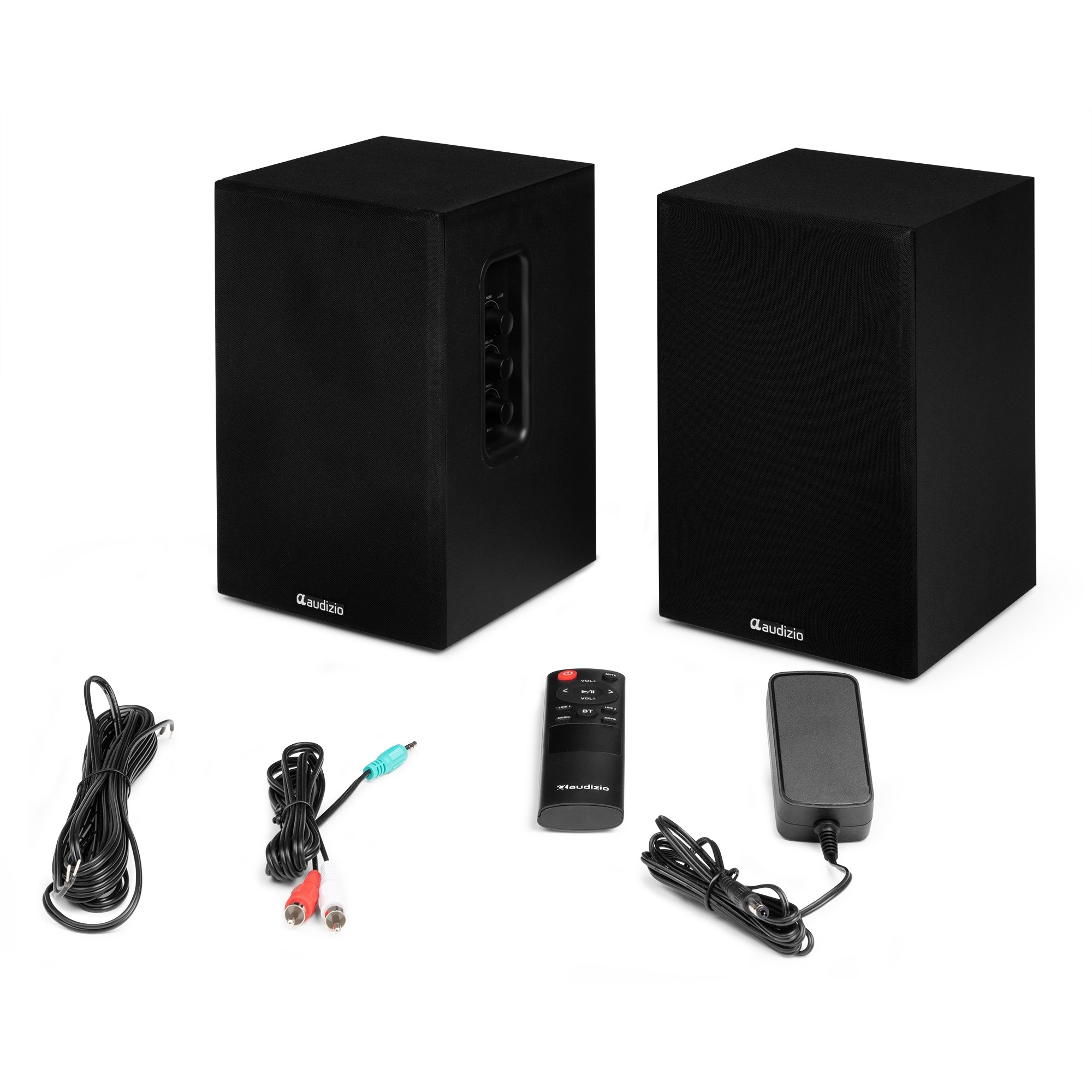 Included accessories: Remote control (wireless), Power adapter, Speaker cable (5m)