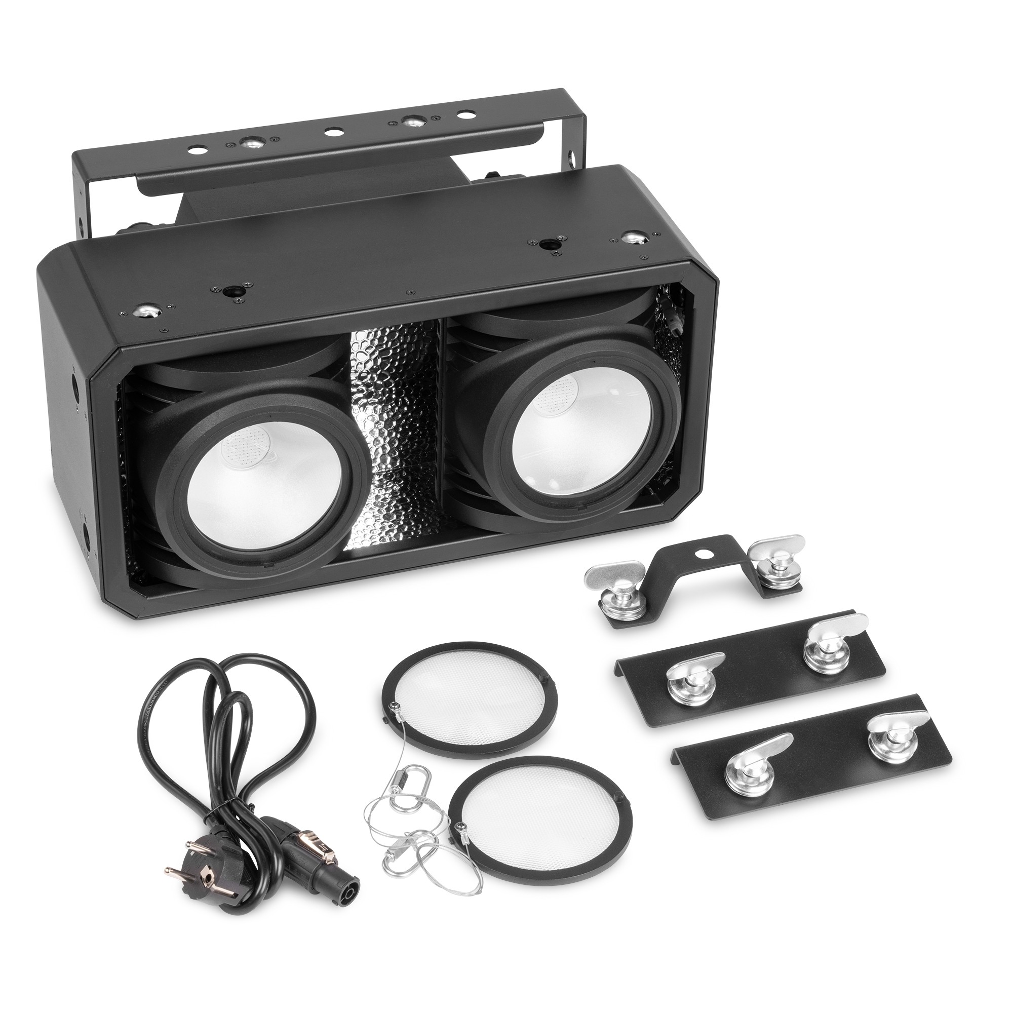 SB250IPFC Stage Blinder s IP65 zaštitom je snažno RGBAL LED rasvjetno tijelo robusnog aluminijskog dizajna s Chip-on-Board (COB) LED diodama koje kombiniraju dva efekta u svom kućištu. Osim standardnog scenskog blindera, ova rasvjetna tijela mogu se koristiti i kao autentični blinder efekt sa živopisnom RGB pozadinom. Miješanjem crvene, zelene i plave može se proizvesti bilo koja boja, dok uključivanje jantarne i lime boje omogućuje proizvodnju čisto bijele ili poboljšanje bilo koje druge boje. Visokofrekventno LED zatamnjivanje stvara glatke efekte blindera i osigurava rad bez treperenja ispod kamere. SB250IPFC odgovara zasljepljujućem svjetlosnom izlazu konvencionalnog Audience Blindera i može se kontrolirati u samostalnom načinu rada ili izravno putem DMX-a. LED diode imaju vijek trajanja do 60 000 sati.