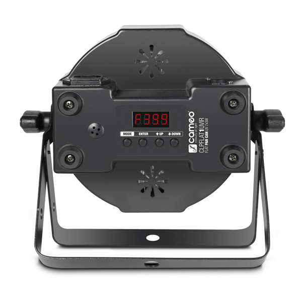 Cameo CLPFLAT1UVIR is a very flat, luminous PAR projector with seven 3 watt high power UV LEDs, dimmer and strobe functions and a 40° beam angle. High-efficiency convection cooling provides noise-free operation.