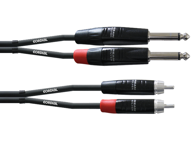 Stereo Starters: REAN/made by NEUTRIK metal connector, unbalanced twin bulk cables with sturdy jacket, separable due to innovative cutting point fixation clamps. 2 x Cinch – 2 x Plug 6.3 mm mono