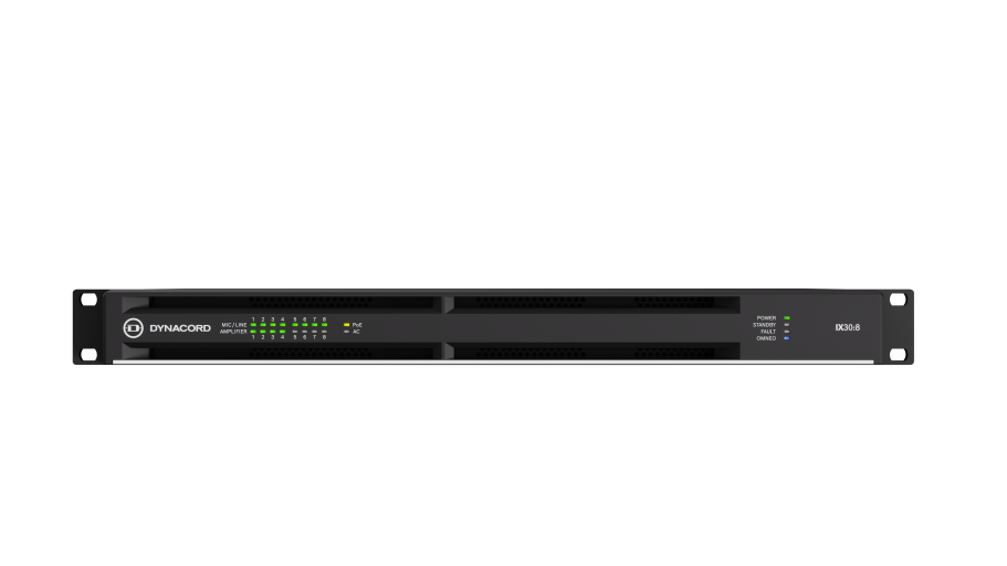 IX30:8 – 8-channel DSP networked amplifier, 3kW powerTANK, 8×8 Dante, OCA, 8 mic/line inputs