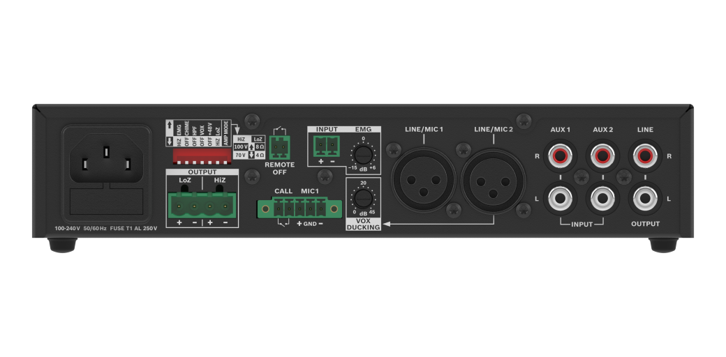DIP switches: EMG (HiZ/LowZ), Two-tone Chime (ON/OFF), HPF (120 Hz), VOX (ON/OFF), Phantom power (+48 V/OFF) Output (HiZ/LowZ), Amp mode (70 V/100 V; 4Ω/8Ω)