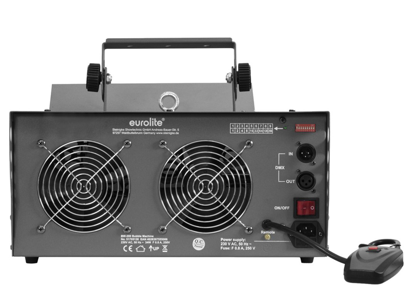 Eurolite BW-200 Uređaj za stvaranje mjehurića Snažan DMX uređaj za viseći ili stojeći rad Rotirajući kotač s prstenovima usisava tekućinu za mjehuriće Ventilator distribuira stvorene mjehuriće po cijeloj prostoriji Vrlo niska potrošnja energije Punjenje tekućinom za mjehuriće bez ikakvih problema DMX512 upravljanje moguće je putem bilo kojeg komercijalnog DMX kontrolera (zauzima 1 kanal) Adresiranje i podešavanje putem DIP prekidača Mogućnost viseće ili stojeće instalacije Bezbrojne mogućnosti primjene za modne revije, diskoteke, karnevale itd. Spreman za spajanje s utikačem Jednostavno napunite tekućinu – spremno! Priključak za napajanje: Mrežni ulaz IEC priključak (M) verzija za montažu Kabel za napajanje sa sigurnosnim utikačem (M) (isporučen) Upravljanje: DMX
