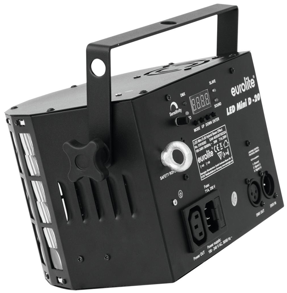 LED Mini D-20 hibridni efekt snopa Praktičan efekt s derbyjem, stroboskopom i DMX-om Može se koristiti samostalno ili putem DMX sučelja DMX512 upravljanje moguće je putem bilo kojeg komercijalnog DMX kontrolera 1 ili 4 DMX kanala dostupni su za brojne primjene Upravljanje zvukom putem ugrađenog mikrofona Osjetljivost mikrofona podesiva rotacijskim regulatorom Udobno adresiranje i podešavanje putem upravljačke ploče s LED zaslonom i četiri tipke za upravljanje