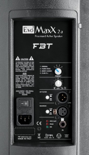 FBT EVO2MAXX 2A – AKTIVNI ZVUČNIK S OBRAĐENIM ZVUČNIKOM 400 W + 100 W RMS – 128 dB SPL 2-smjerni, bi-amplificirani, bass reflex dizajn kabineta 250 mm (10″) LF woofer s 50 mm (2″) zvučnom zavojnicom, izrađen po mjeri za FBT 25 mm (1″) izlaz za grlo B&C HF kompresijski drajver Frekvencijski odziv od 58 Hz do 20 kHz Bi-amped: 400 W RMS LF, 100 W RMS HF, pojačala snage klase D s preklopnim napajanjima Digitalni procesor signala s 4 unaprijed postavljena podešavanja za izjednačavanje