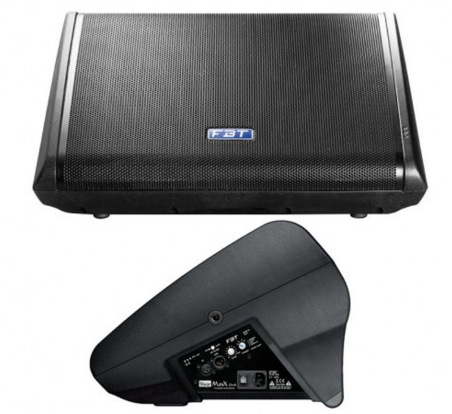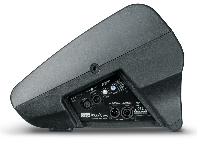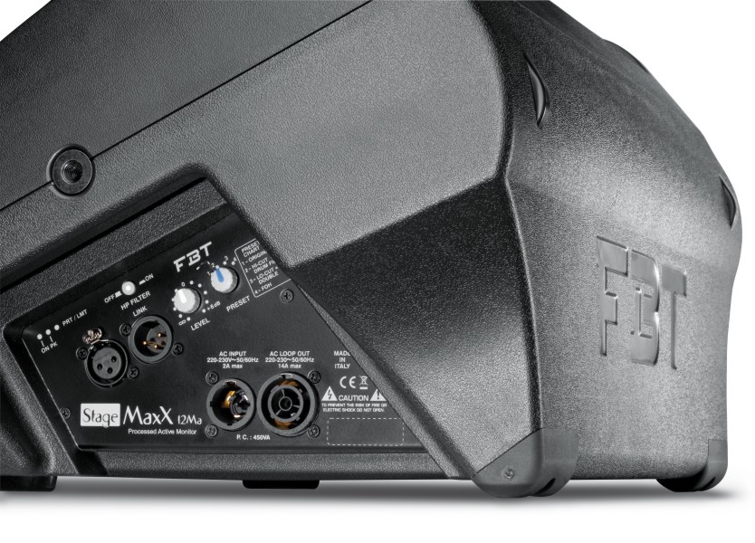FBT STAGEMAXX 12MA – OBRAĐENI AKTIVNI MONITOR S POJAČANJEM 400W + 100W RMS – 130 dB SPL 2-smjerni, bi-amp, bass reflex dizajn kabineta Koaksijalni prilagođeni FBT 12″ B&C zvučnici sa 64 mm (2,5″) zvučnom zavojnicom B&C 25 mm (1″) izlazni kompresorski drajver i 44 mm (1,7″) zvučna zavojnica Bi-amp: visokodinamička pojačala klase D 400W + 100W RMS za ugodan zvuk čak i pri velikoj glasnoći Visokoučinkovito napajanje s prekidačem Digitalni procesor signala s 4 tvorničke postavke izjednačavanja