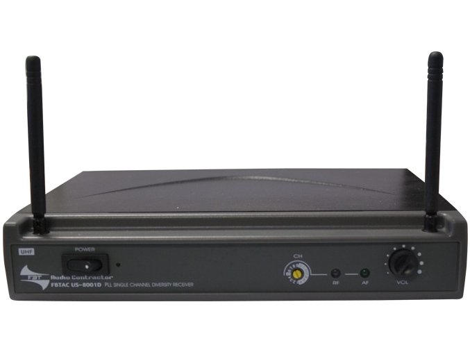 FBT US 8001D – Jedan kanal – 494MHz-870MHz. Pogodno za 1 odašiljač (Mh750, Mh920, PT850B) Bazni prijemnik za UHF PLL bežične sustave Radni opseg 494,00 MHz – 870,00 MHz Prijemnik u TRUE DIVERSITY tehnologiji Podrška za jedan mikrofon-odašiljač: MH 750, MH 920 ili PT 850 B 16 prijenosnih kanala (728 MHz – 806 MHz)