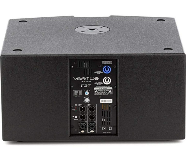 FBT VERTUS CLA 208SA – AKTIVNI SUBWOOFER S PROCESOM CLA 208SA je aktivni subwoofer od 2 x 8″ u bass-reflex dizajnu i kućištu od brezove šperploče. Unutarnje pojačalo klase D isporučuje 600 W i upareno je s prekidačkim napajanjem i DSP procesorom s funkcijama filtriranja, izjednačavanja i zaštite zvučnika. Izrađen s idejom proširenja niskofrekventnih performansi CLA608A u live primjenama, CLA208SA služi kao osnovni nosač za stupni zvučnik CLA604A koji se može montirati frontalno na subwoofer, kao i pričvrstiti na opcionalni stalak putem M20 utičnice na gornjoj strani subwoofera. Subwooferi CLA208SA su također modularni i mogu se slagati kako bi se povećao maksimalni SPL.