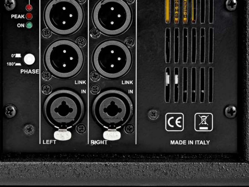 Control panel with combo XLR/Jack stereo input and link, XLR Hi-pass out stereo, volume, presets, 0°-180° phase switch, status LED