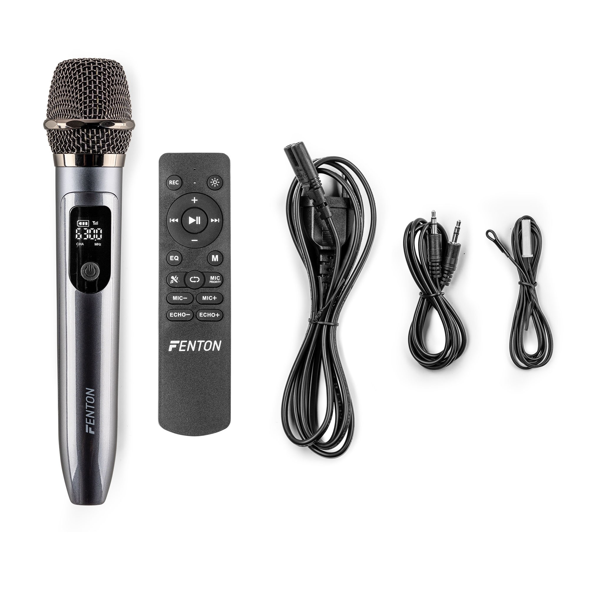 Included accessories: Handheld microphone (wireless), Remote control (wireless), Power cable