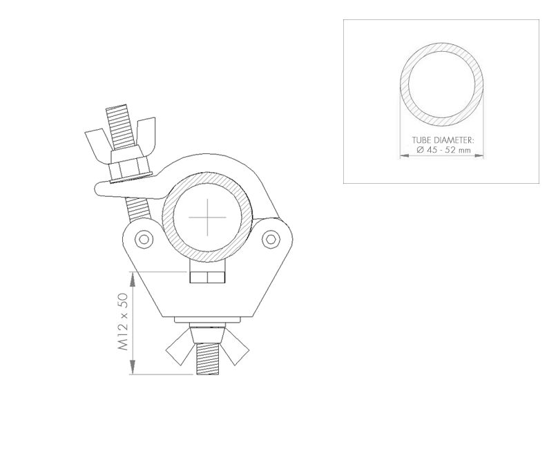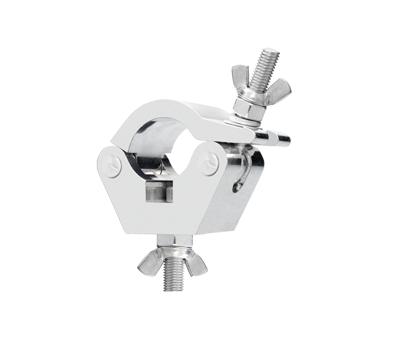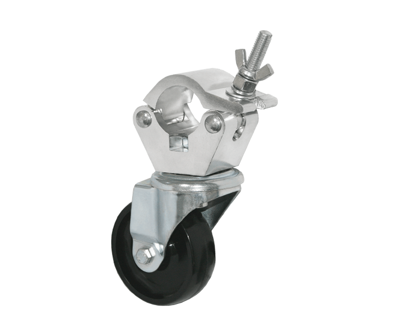 Heavy-duty aluminium half coupler provided with a Ø 100 mm swivelling wheel. Designed to be used on trusses / tubes with an external diameter from 45 mm to 52 mm. It has a double blocking system with nut and wing nut which makes it the right coupler to the most demanding set-ups like in theatres, live shows, events etc. where the most stringent safety requirements must be met.