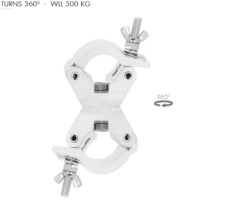 Aluminium double swivel clamp coupler (Swivelling 360º), specially designed for heavy loads (500 kg). Designed to be used on trusses / tubes with an external diameter from 45 to 52 mm.