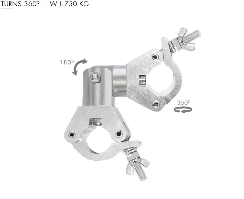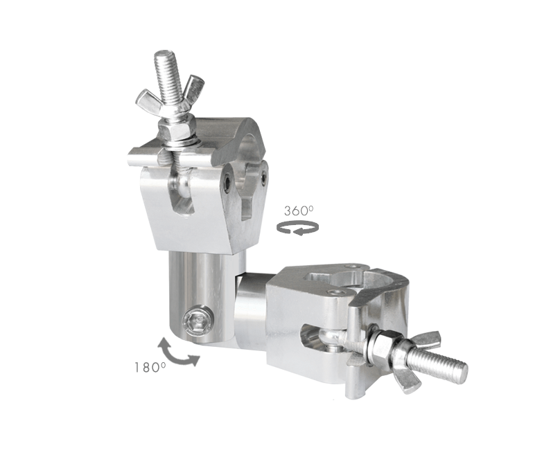 Double coupler with solid aluminium hinge, used to join 2 adjacent tubes permitting 360° rotation and 180° of lateral movement.