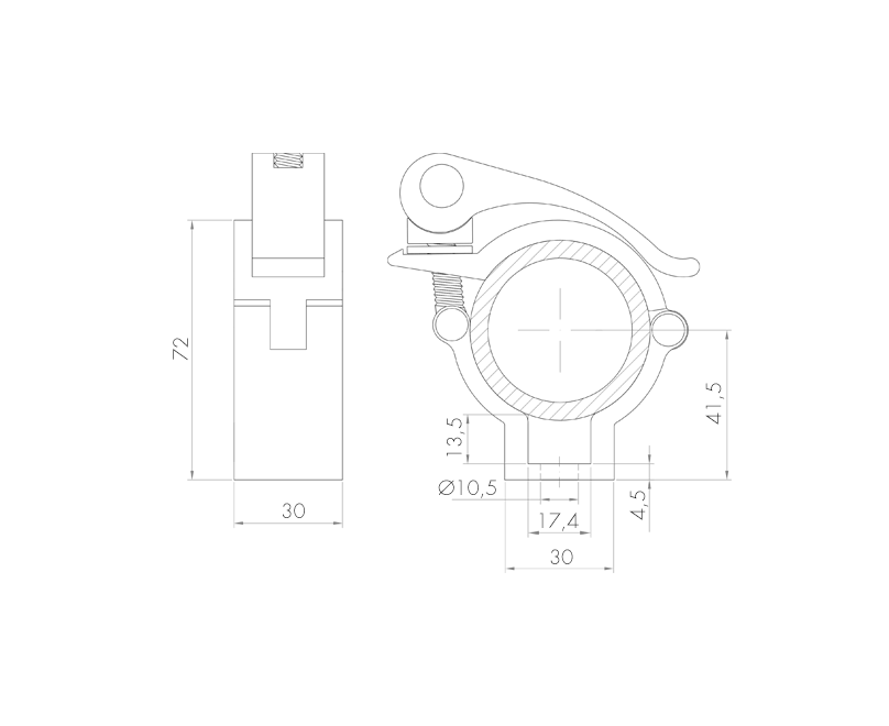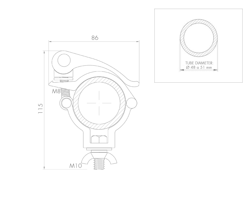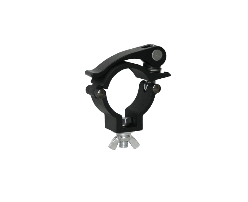 Light-weight aluminium clamp coupler for loads up to 100 kg. It comes with pressure lever and bolt and wing nut to secure, spotlights, electronic devices, etc. Designed to be used on trusses / tubes with an external diameter from 48 mm to 51 mm.
