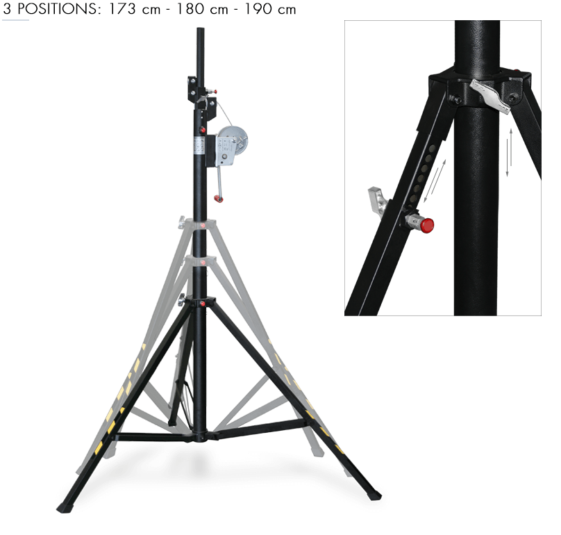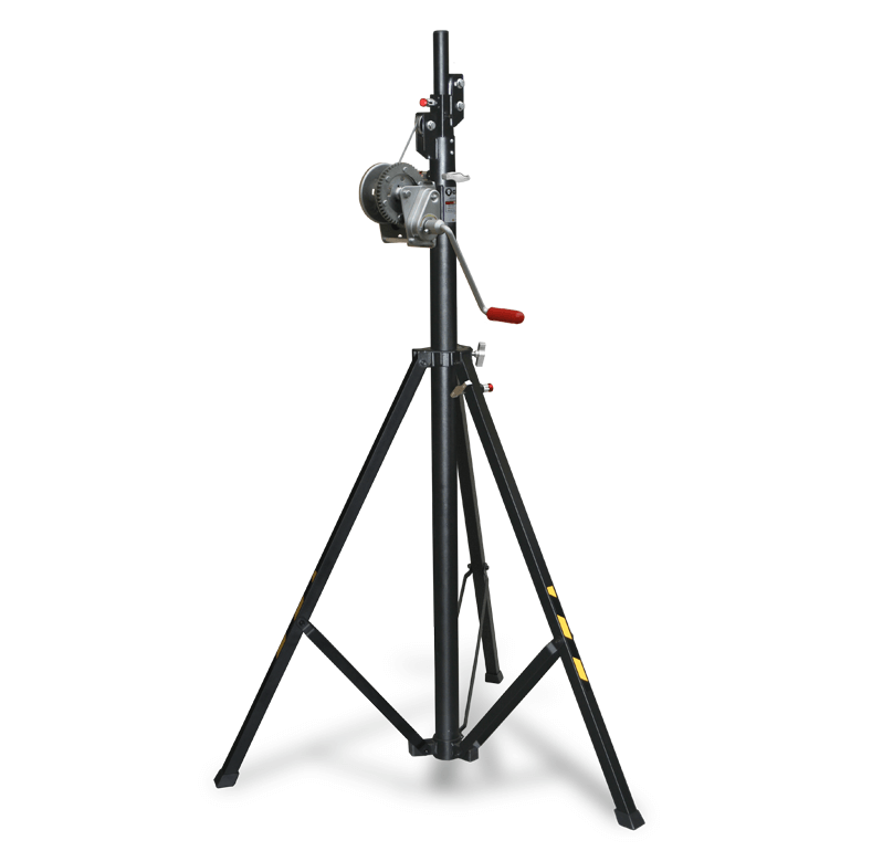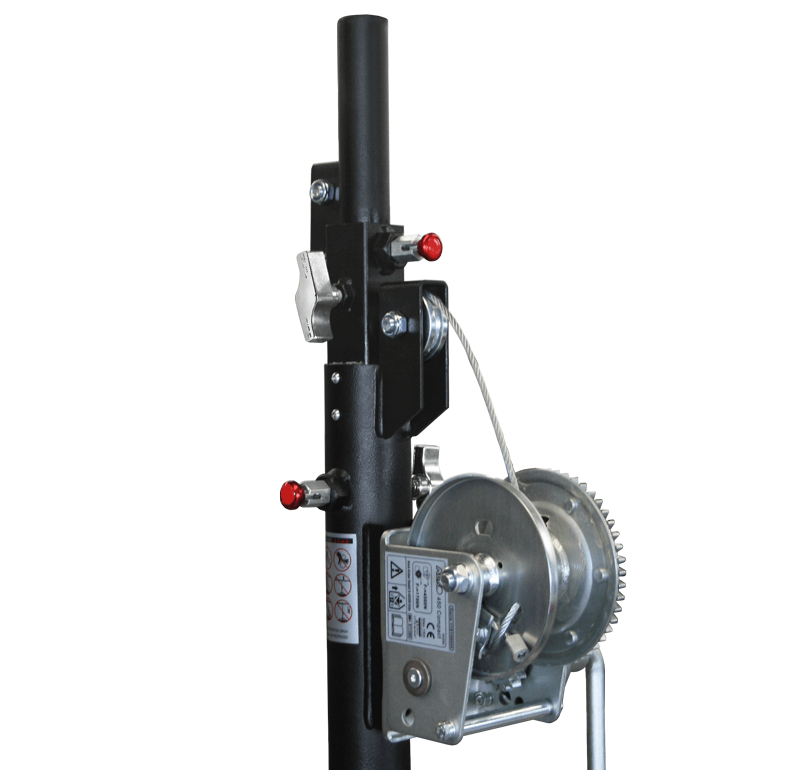 Kompaktna teleskopska dizalica za reflektore, posebno dizajnirana za jednostavan transport u sklopljenom stanju. Certificirana je za podizanje tereta do 100 kg na maksimalnu visinu od 4,00 metara i ima gornju osovinu promjera Ø 35 mm.
