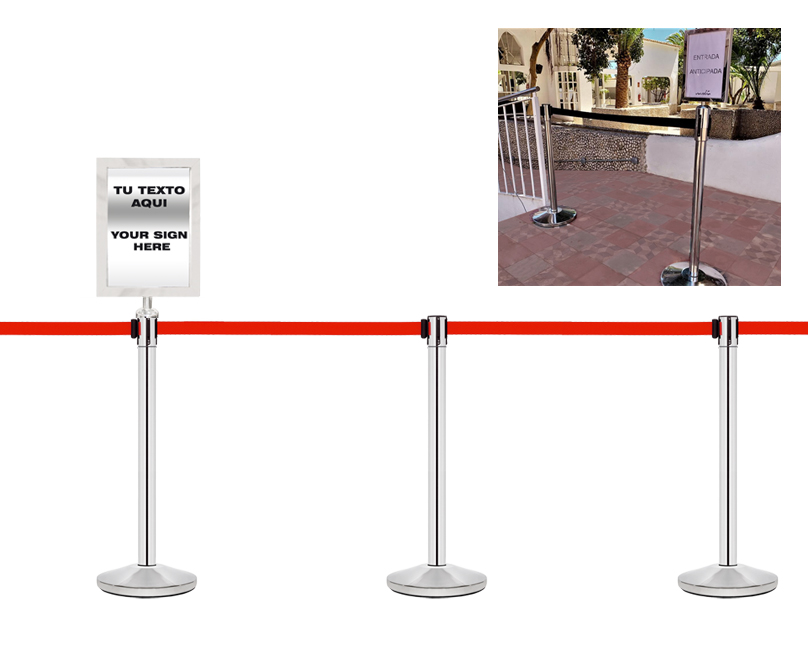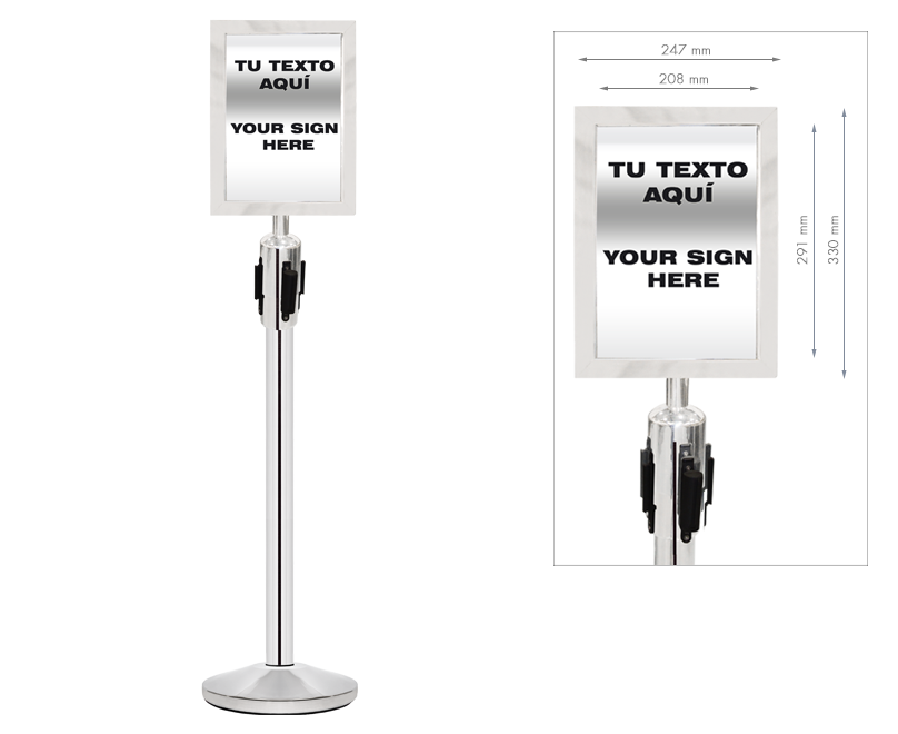 Adaptor to display documents of DIN A4 size (portrait). It is designed to be used with our retractable belt barriers ref. PST-11 or PST-11/N. It fits perfectly onto our retractable belt barrier post head piece, allowing the belt to be extended and belts from other posts to be attached to it.