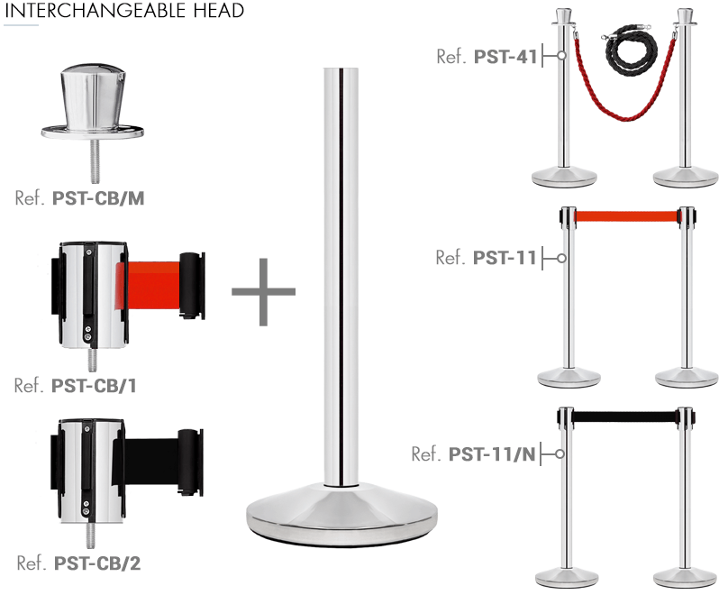 The PST-CB/M headpiece can be substituted by other headpieces so you can use just one post for different barrier options; red belt (PST-CB/1) or black belt (PST-CB/2). This special system allows you to cut down on costs and save on storage space.