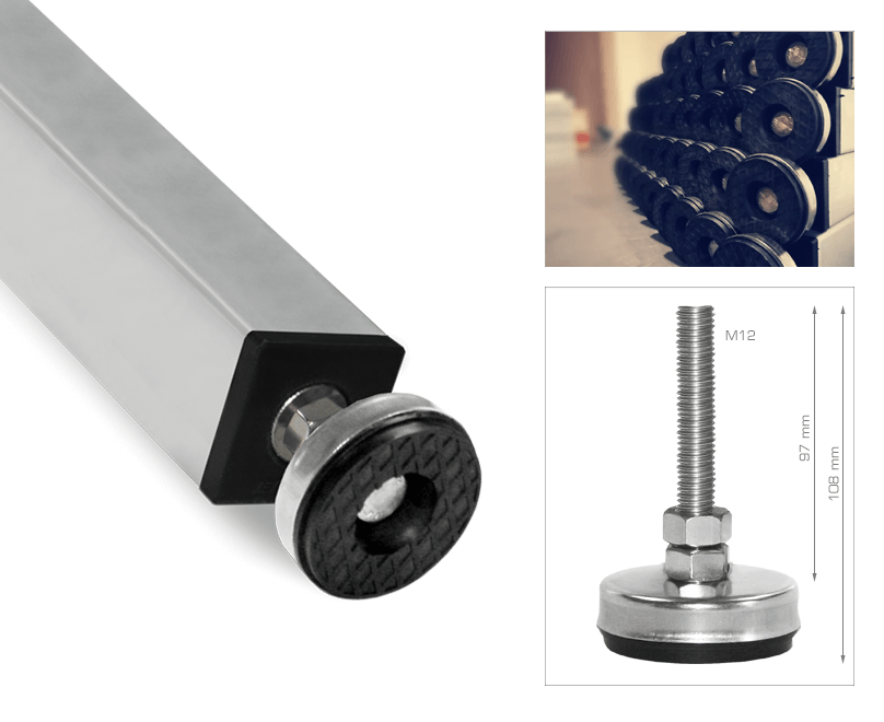 Fixed height leg with square profile of 50 x 50 mm manufactured with extruded aluminium. This removable leg is provided with a stainless steel threaded bolt that has a non-skid rubber foot pad (adjustable by 50 mm), ensuring a perfect fit to any surface.