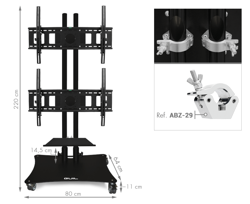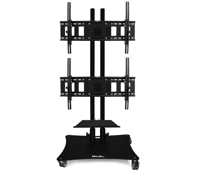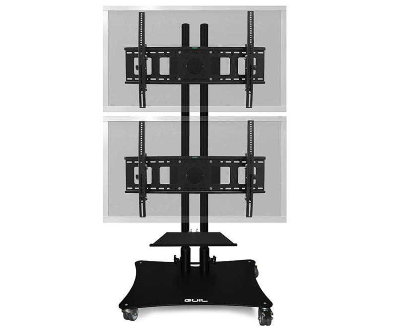 Professional mobile stand to display two TV screens from 32 to 65 inches with a total maximum weight of 70 kg. Fits any screen with VESA standard hole size: max 800 x 500 mm.