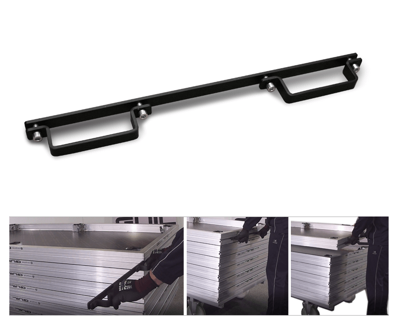 Very useful set of handles so that 2 people can quickly and easily move a stage deck. The set consists of 2 handles (for both sides of the platform).