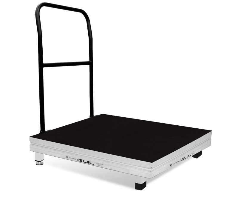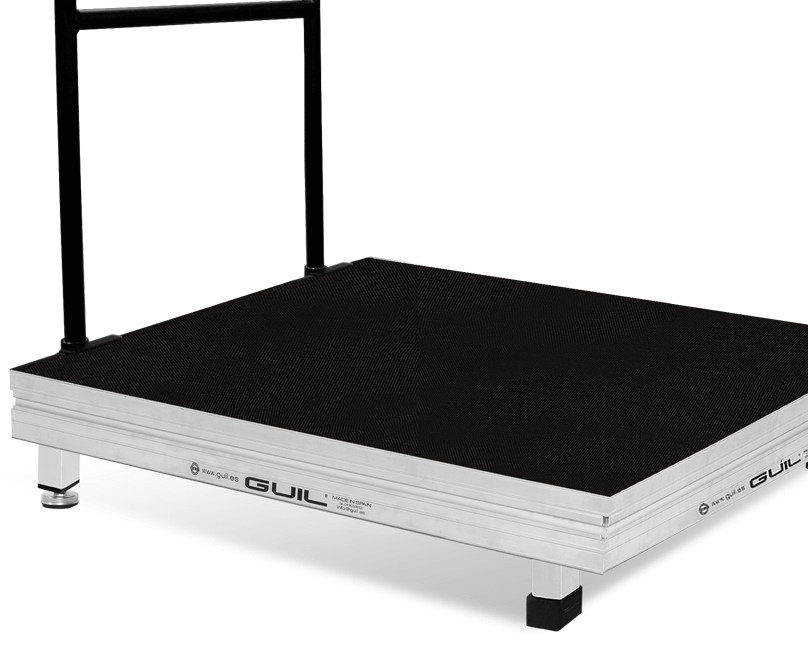 Weather resistant, 1 x 1 m Conductor’s podium, made with extruded aluminium and high quality, 100% Birch plywood panel (WBP) from Finland. It is provided with a detachable rail made in aluminium and finished in black powder-coat paint.