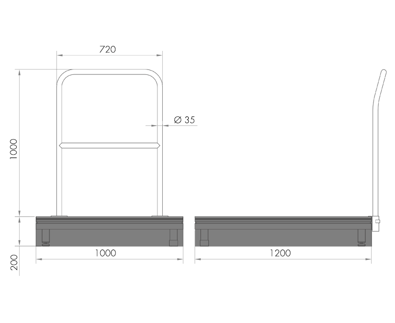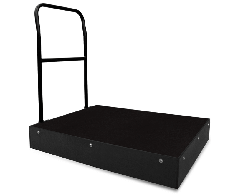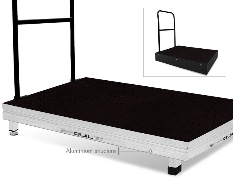 Weather resistant, 1.2 x 1 m Conductor’s podium, made with extruded aluminium and high quality, 100% Birch plywood panel (WBP). It is provided with a detachable rail made in aluminium and finished in black powder-coat paint and an elegant wooden skirting which covers the base of the podium.