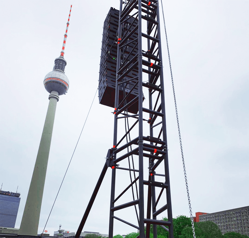 Specially designed for a reliable lift of Line Array Systems of up to 800 kg to a maximum height of 8 metres. Its practical compact design offers easy handling and manoeuvrability and a reduced storage size. One complete unit has a volume of just 3.68 m3.