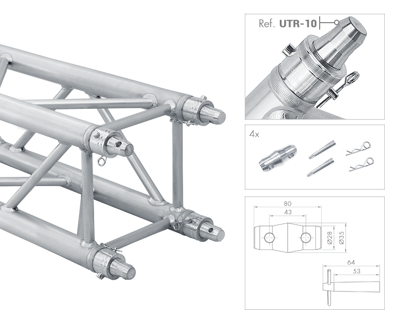 The TQN290 square truss connection is made using the UTR-10 coupling system, made up of solid aluminium conical coupler, locking pins (spigots) and safety R-Springs, which allows a fast, quick and reliable assembly. Each truss comes complete with the coupling system included (4 x UTR-10: 4 double conical couplers, 8 locking pins and 8 safety R-springs).