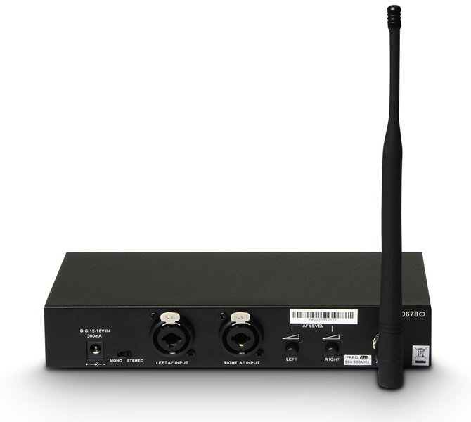 One 9.5″ transmitter with 2 x XLR / 6.3 mm Jack (combo) inputs and level controls, level meter left / right, mono / stereo switch, adjustable headphone control, and detachable antenna