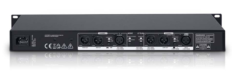 Controls: 2 x crossover frequency low/high, 2 x crossover low/mid, 2 x high gain, 2 x highpass (40 Hz), 2 x input gain, 2 x low gain, 2x frequency switch x1/x10, 4 x inv switch, LF sum, Mono/stereo mode