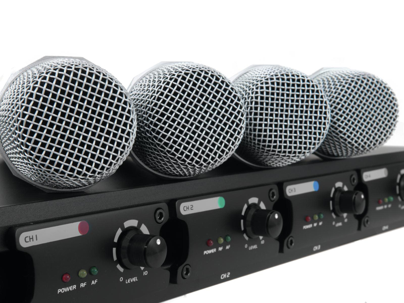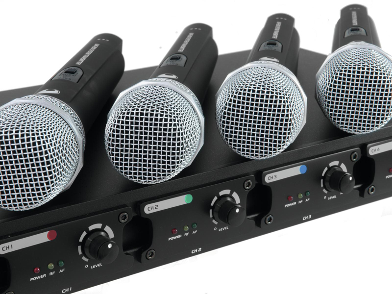 4-channel receiver unit and 4 hand-held microphones with UHF PLL technology