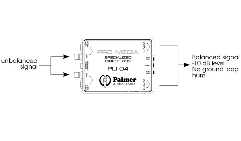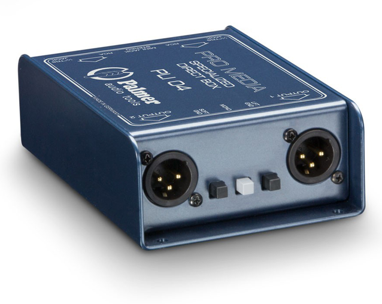 PLI04 – Media DI Box 2-kanalni za PC i laptop S novim PRO MEDIA DI/PLI04, Palmer predstavlja DI-box, proizveden imajući na umu zahtjevne potrebe medija računalnog doba. Korištenjem ove nekomplicirane metode, osobna računala i druga potrošačka oprema s nebalansiranim izlazima mogu se pretvoriti u balansirane, kako bi se npr. izvela prezentacija preko profesionalnog PA sustava. PLI-04 podržava sve uobičajene tipove ulaza, TRS priključke koji prihvaćaju mono ili stereo utikače, RCA phono utičnice i 3,5 mm stereo ulaz za korištenje s izlazom za slušalice prijenosnog računala ili sličnog uređaja.