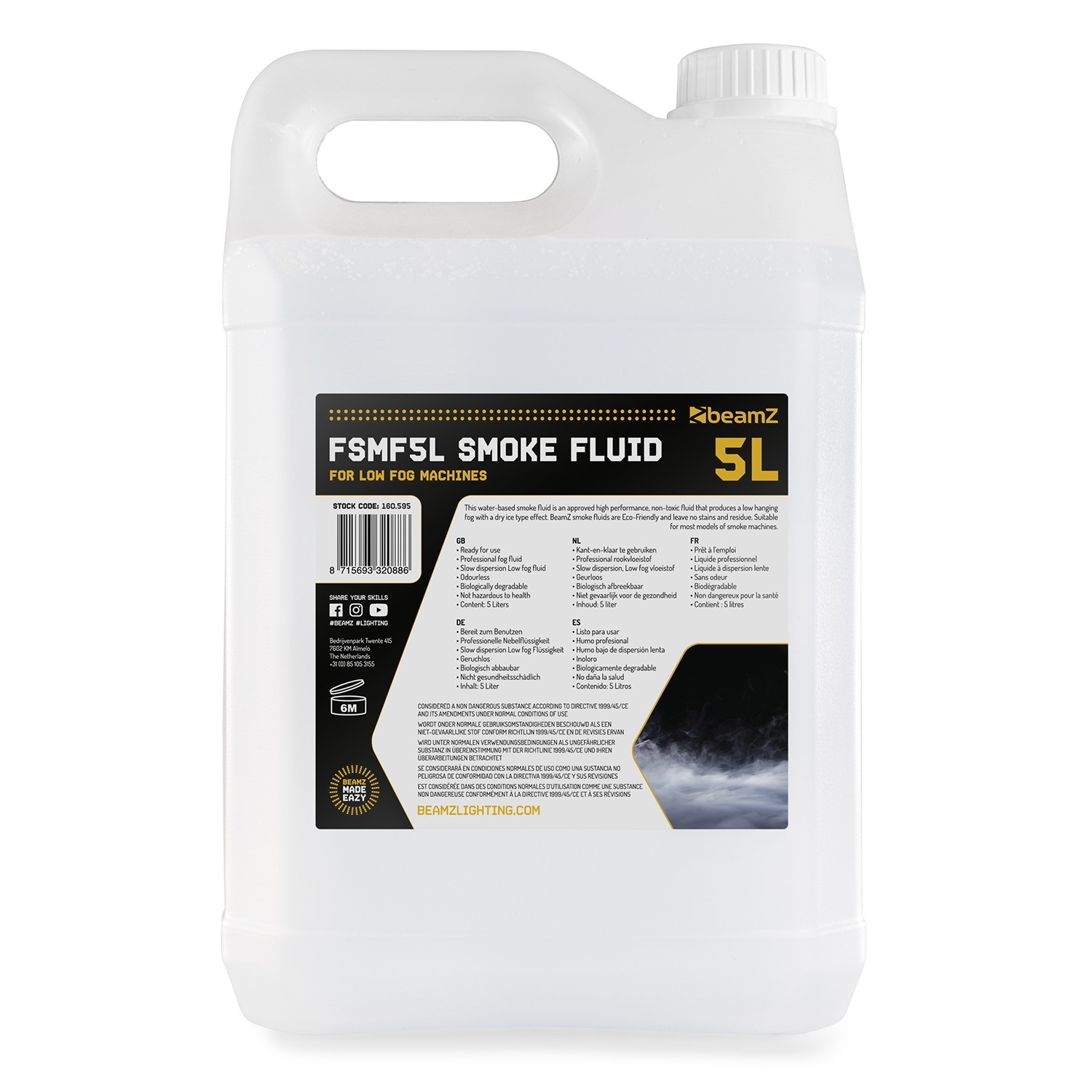 Ova tekućina za dim na bazi vode je odobrena visokoučinkovita, netoksična tekućina koja proizvodi nisko viseću maglu s efektom suhog leda. BeamZ tekućine za dim su ekološki prihvatljive i ne ostavljaju mrlje i ostatke. Pogodno za većinu modela uređaja za nisko zamagljivanje.
