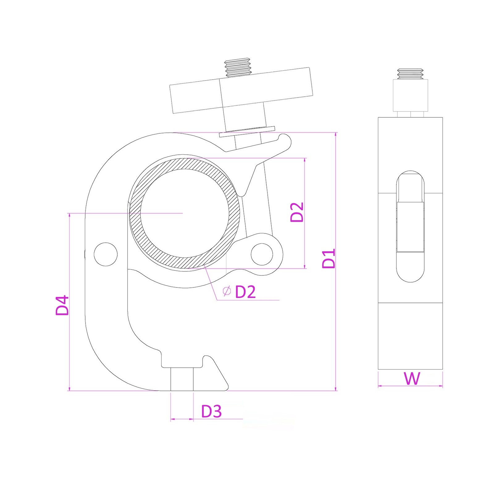 Ova teška univerzalna stezaljka s okidačem dizajnirana je da omogući jednoj osobi vješanje teških svjetiljki automatskim zatvaranjem brze spojnice. Za montažu na cijevi i rešetke. Visokočvrsta aluminijska konstrukcija.