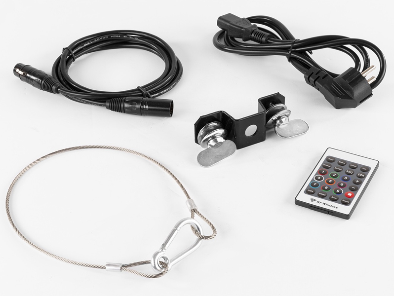 Accessories: DMX Cable, Mounting bracket, Power Cable, Remote control, Safety cord