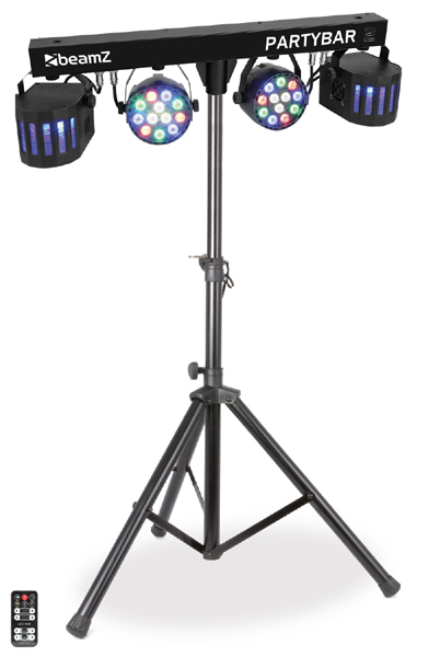 Partybar2 je kompletno DJ rasvjetno rješenje opremljeno s 2 PAR kutije s visokointenzivnim RGBW LED diodama i 2 Derby svjetla. Ovim Partybarom2 može se upravljati putem DMX-a, IR daljinskog upravljača ili automatskih i zvučno aktiviranih programa koji se mogu odabrati s upravljačke ploče. Uključen je tronožac za brzo i jednostavno postavljanje. Posebno dizajniran za pozornice, zabave, zabavljače i sve ostale posebne događaje.