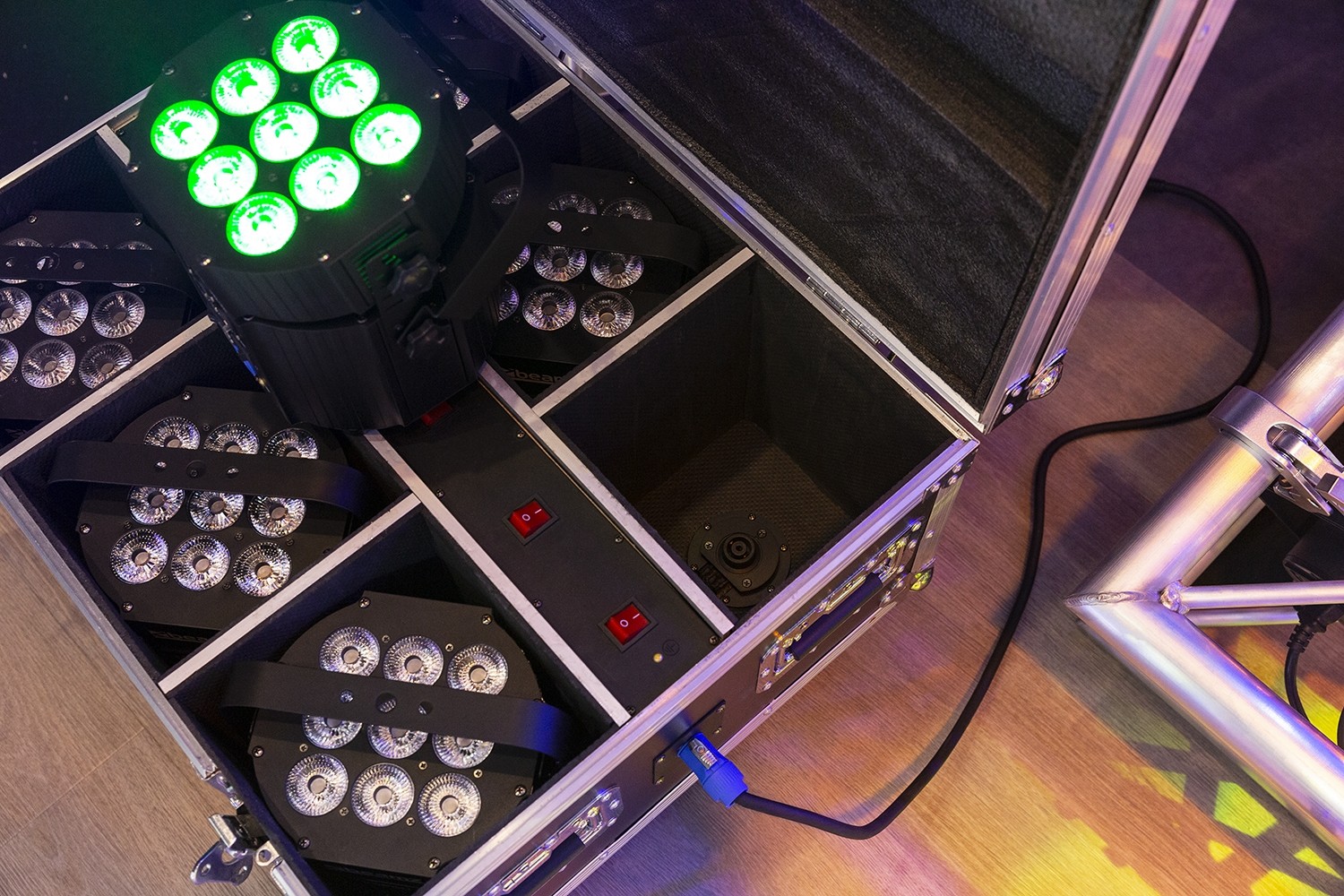 Kompletan set od 6 komada BBP60 rasvjetnih tijela u koferu s ugrađenom stanicom za punjenje. Svaki BBP60 ima bateriju od 25 Ah koja će trajati više od 10 sati s jednim ciklusom punjenja. Nakon završetka svirke, jednostavno možete vratiti rasvjetna tijela u kofer i puniti ih preko noći. Svako rasvjetno tijelo ima poseban priključak za punjenje na dnu koji se izravno spaja na kofer. Jednostavno spojite kofer s utičnicom i gotovi ste. Ovaj set isporučuje s bežičnim DMX odašiljačem za potpuno bežično korištenje bez potrebe za dodatnim proizvodima. Svaki set isporučuje se kao 6 rasvjetnih tijela u koferu ugrađenom u kofer.